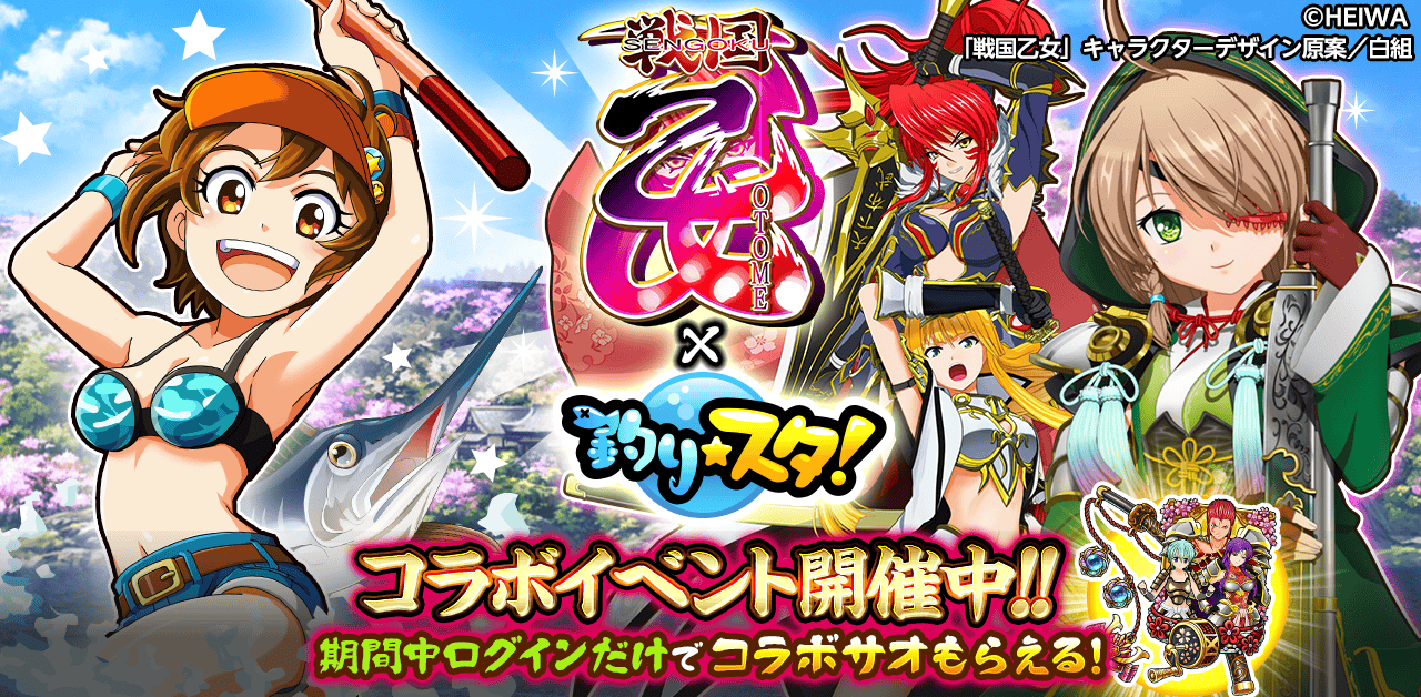 「釣り★スタ」が「戦国乙女」とコラボ開催!イベント「覇権を巡る闘争」「乙女たちの軌跡」をプレイして豪華報酬を手に入れよう!かわいいコラボサオ、アバターも多数登場!コラボ期間中「釣り★スタ」にログインするだけでコラボ限定サオを全員にプレゼント!